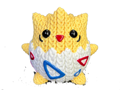 La figura de Togepi está diseñada con un estilo que imita la textura y apariencia de un tejido de crochet. El cuerpo de Togepi es de un suave color blanco, con un acabado que simula los puntos de un ganchillo, dándole un aspecto acogedor y artesanal. Su cabeza presenta las típicas orejas puntiagudas y una gran sonrisa, resaltando su naturaleza alegre y amigable.